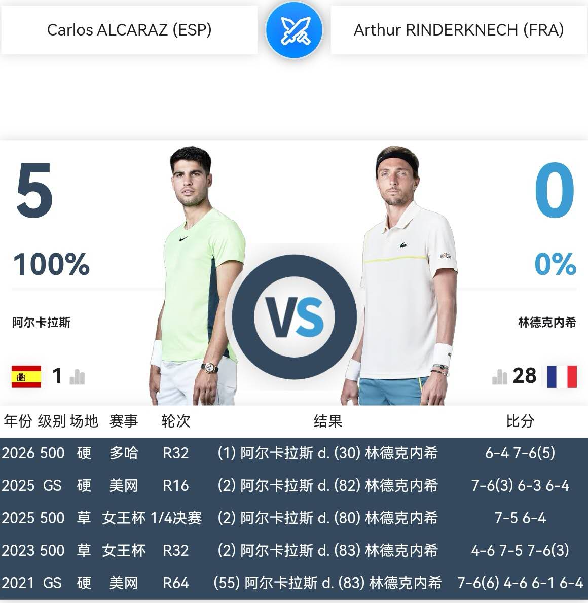 Born in 2003, Alcaraz and born in 1995, Lindeknech have faced each five times in their careers so far, with Alcaraz winning all five matches, including the most recent three where he did not lose a single set and completely shut out his opponent. Particularly noteworthy is that from the 2021 US Open to the 2026 ATP500 Doha tournament, Alcaraz faced Lindeknech five times, and after each victory, he achieved excellent results. In their first encounter at the 2021 US Open, Alcaraz ultimately reached his first Grand Slam quarterfinal, becoming one of the earliest post-2000 players to do so alongside Canada's cool young black player Aliassime. In the subsequent four encounters, Alcaraz ended up winning the championship each time. Therefore, Lindeknech truly is Alcaraz's lucky star.