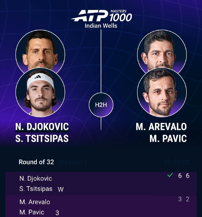Doubles court: In a first-round match, wildcard entrants Djokovic/Sitsipas defeated third seeds Arevalo/Pavic 6-3, 6-2, advancing smoothly, giving Djokovic two wins in one day. In the second round, they will face the cousin duo Lindeknecht/Vachero. Meanwhile, Sinner/Opelka lost to top seeds Granollers/Zeballos 4-6, 4-6, stopping in the first round.