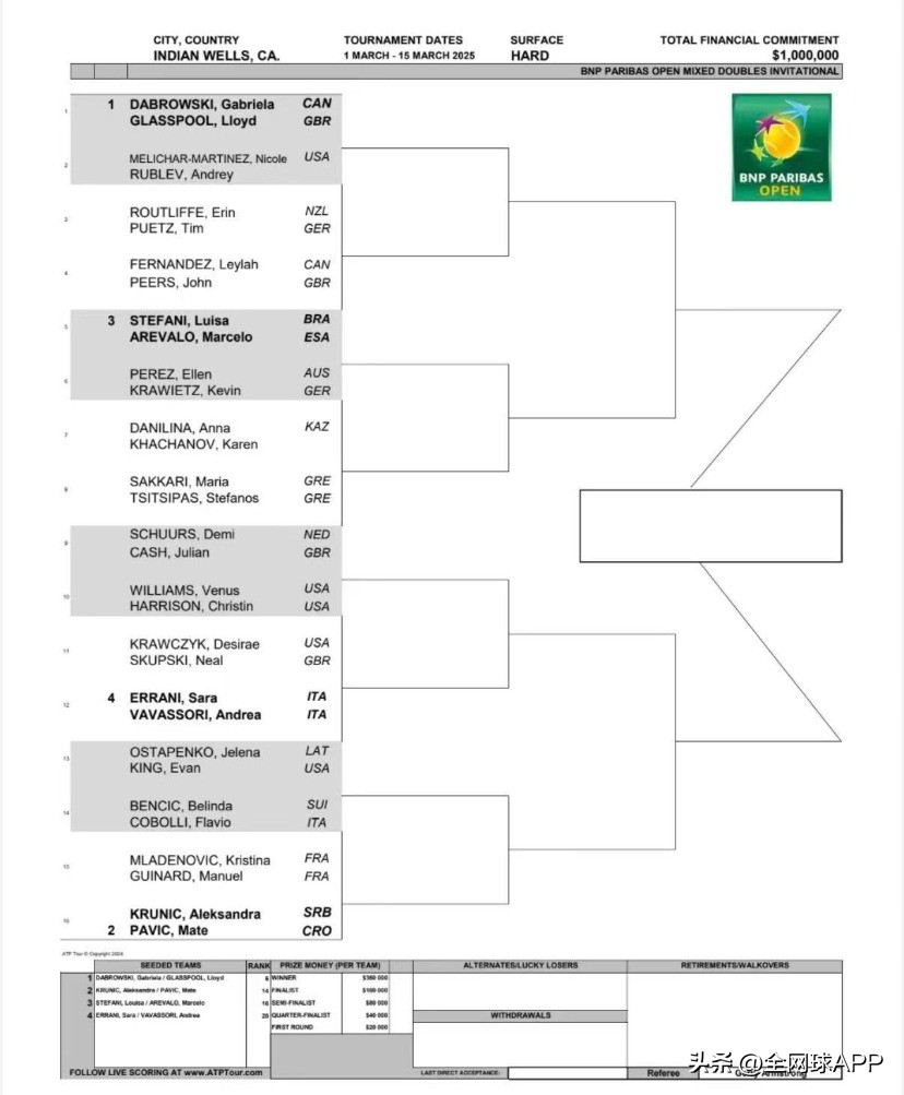 The mixed doubles draw for Indian Wells was also released today, with 16 pairs competing for a share of the million-dollar prize. Grand Slam champion pair Errani/Vavassori and this season's Australian Open runners-up Mladenovic/Giné have entered. Several top singles players who exited earlier, such as Rublev, Khachanov, Tsitsipas, Sakkari, and Fernandez, will also join the competition.