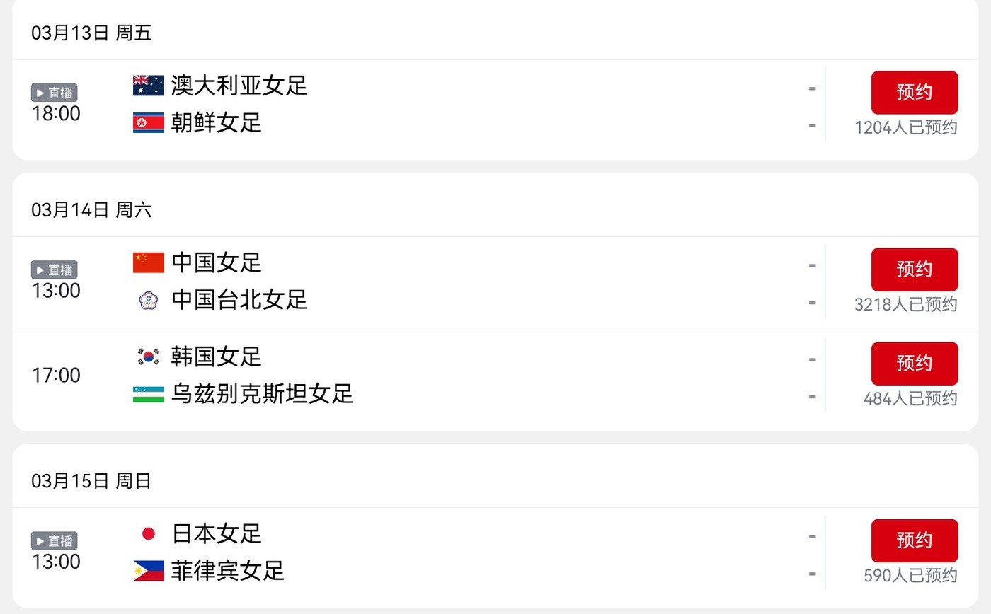 The match time for the Chinese women's football team versus the Chinese Taipei women's team in the quarter-finals has been set at 13:00 noon this Saturday (March 14, 2026) Beijing time. Further details are shown in the image below.