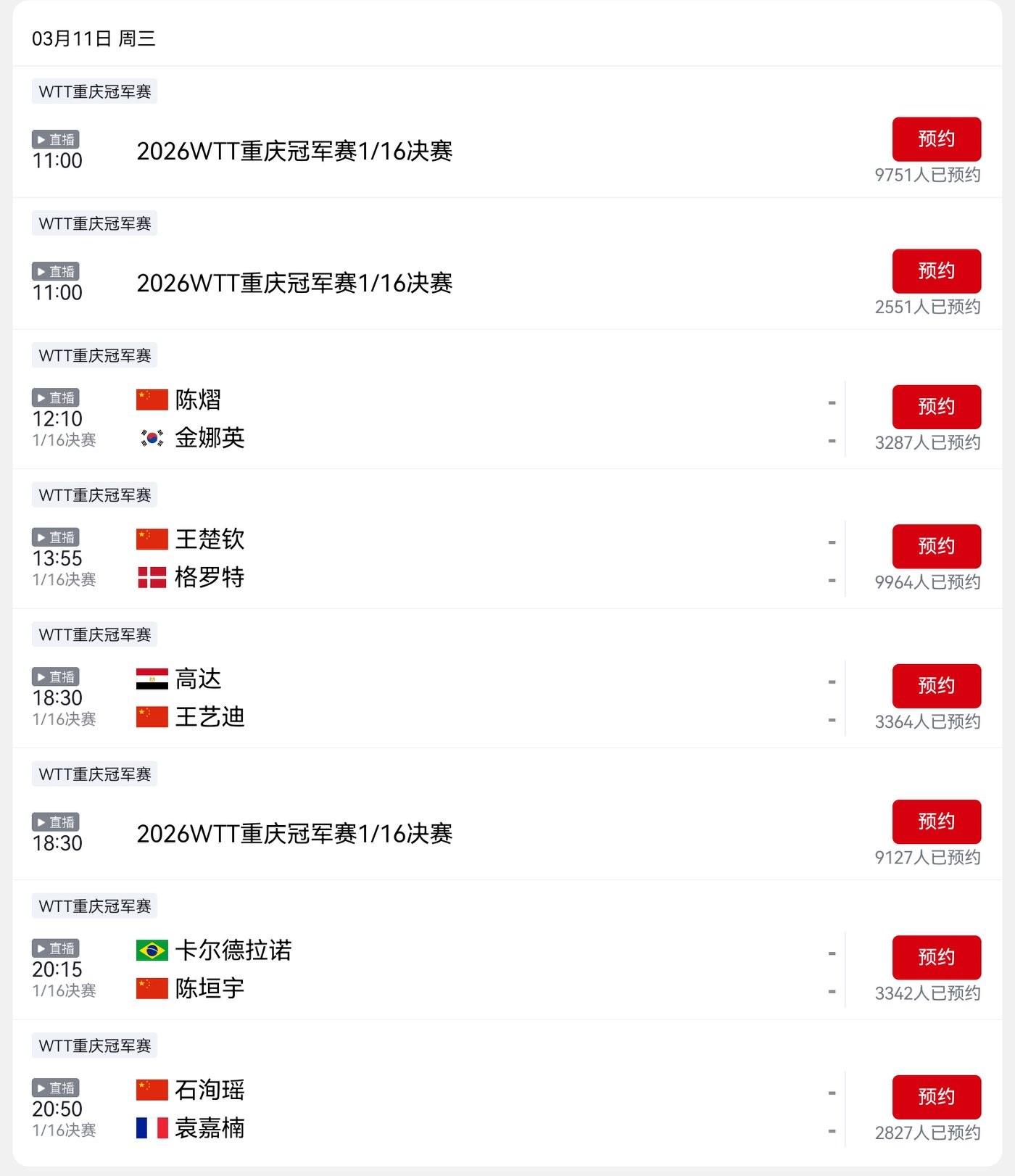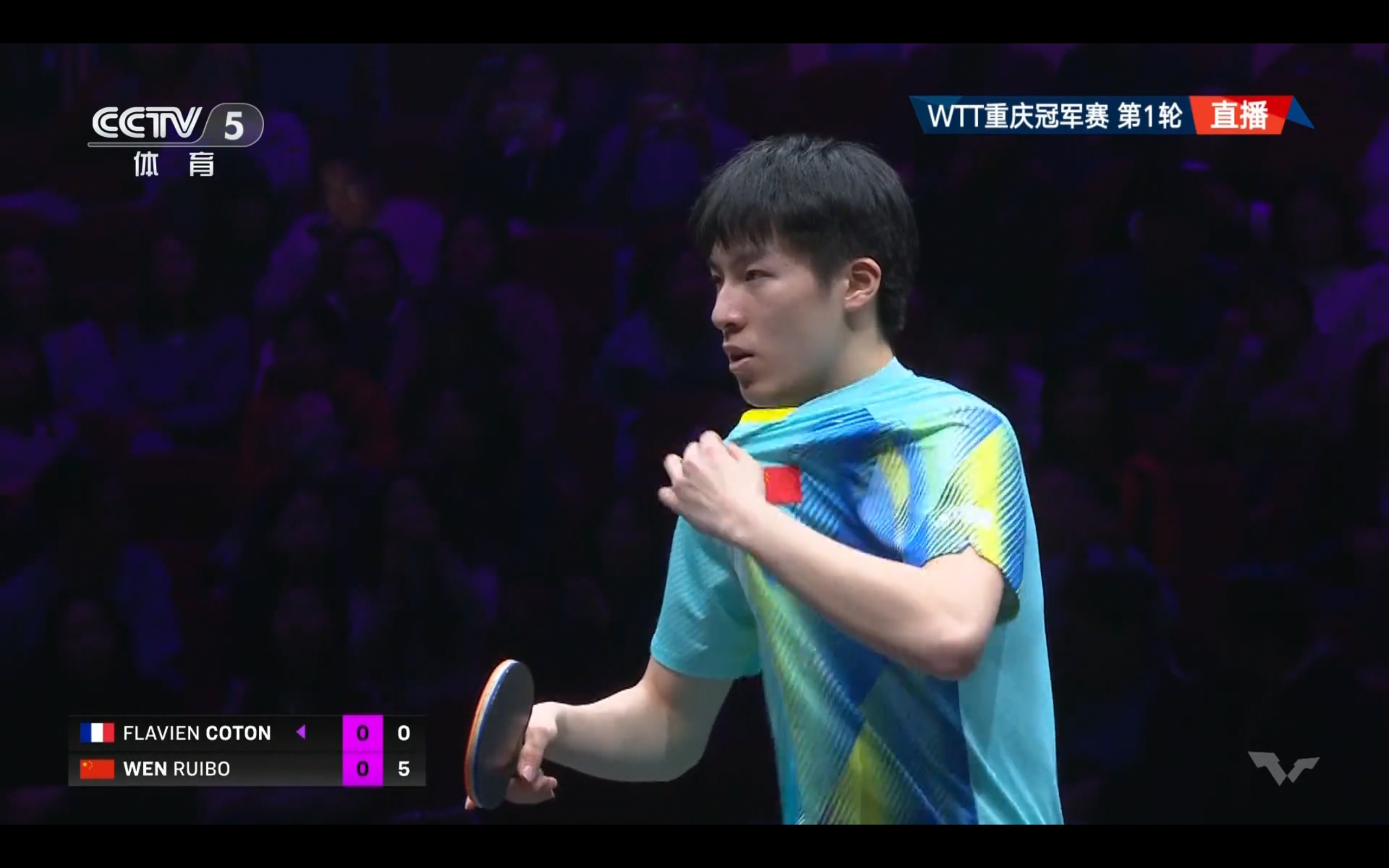 CCTV-5 is broadcasting the WTT Champions Chongqing Station match between Wen Ruibo and Cotton, with tomorrow's schedule (2026.3.11) included.