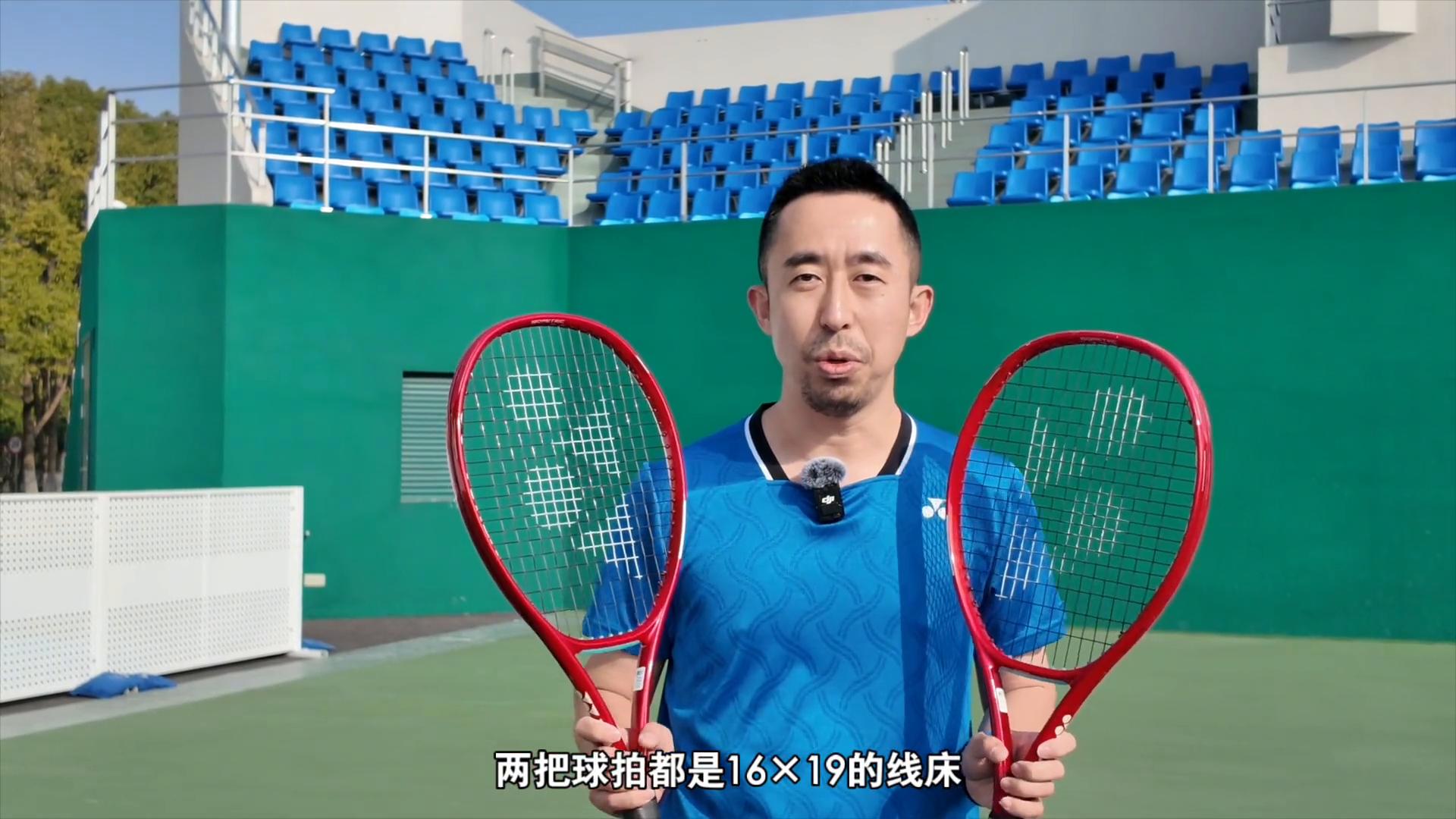 First, let me introduce the parameters of these two rackets. This one is the VCORE 98, with a 98-inch head size and an unstrung weight of 305 grams. Its frame is relatively narrower. This one is the VCORE 100, weighing 300 grams, and its frame is slightly thicker compared to the 98.