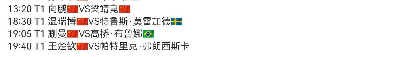 Additionally, the detailed schedule for today is shown in the image below. Wang Chuqin, Kuai Man, Xiang Peng, Liang Jingkun, Wen Ruibo, and others are competing, with CCTV-5+ providing the broadcast. We look forward to their victories and advancement to the next round.