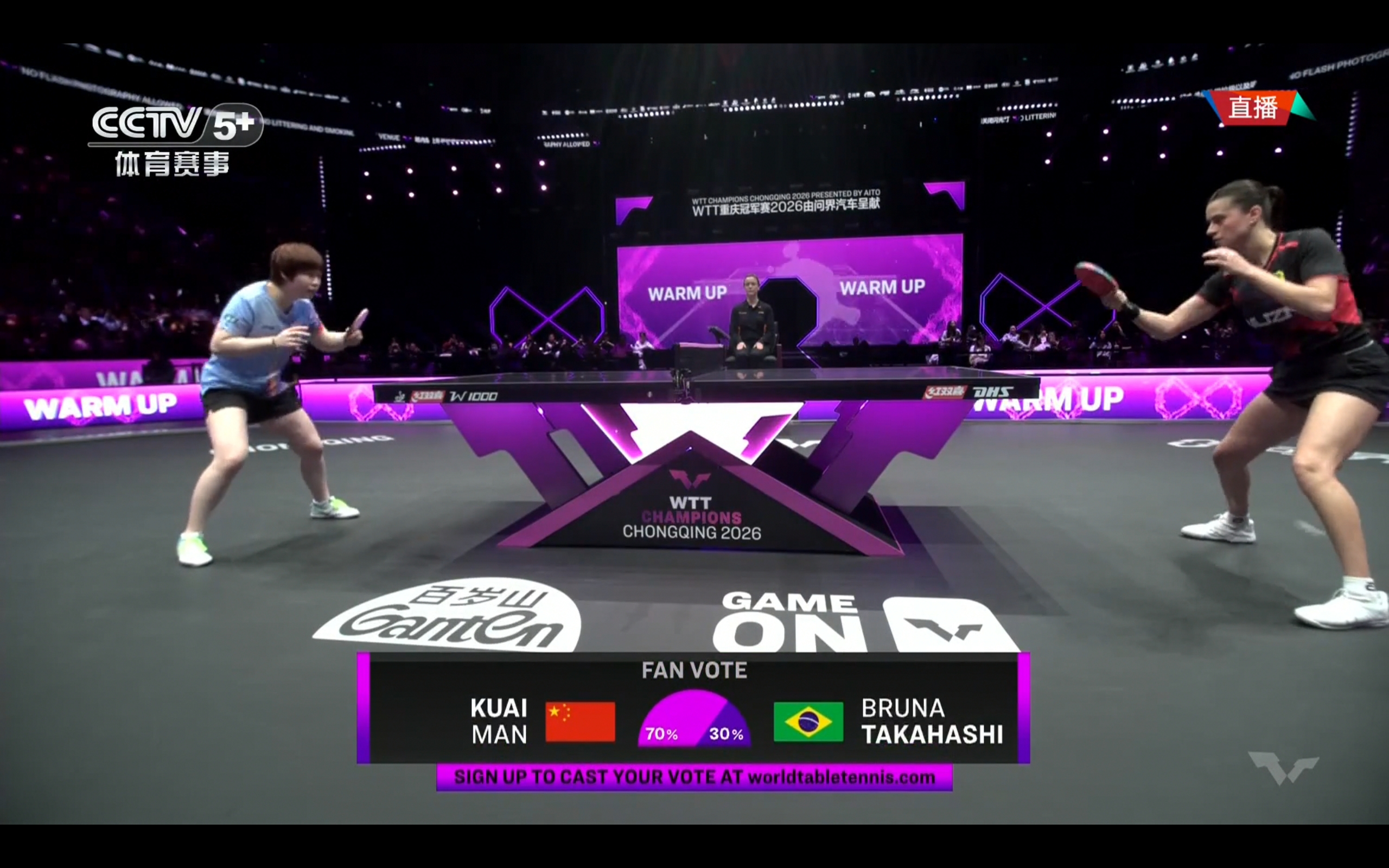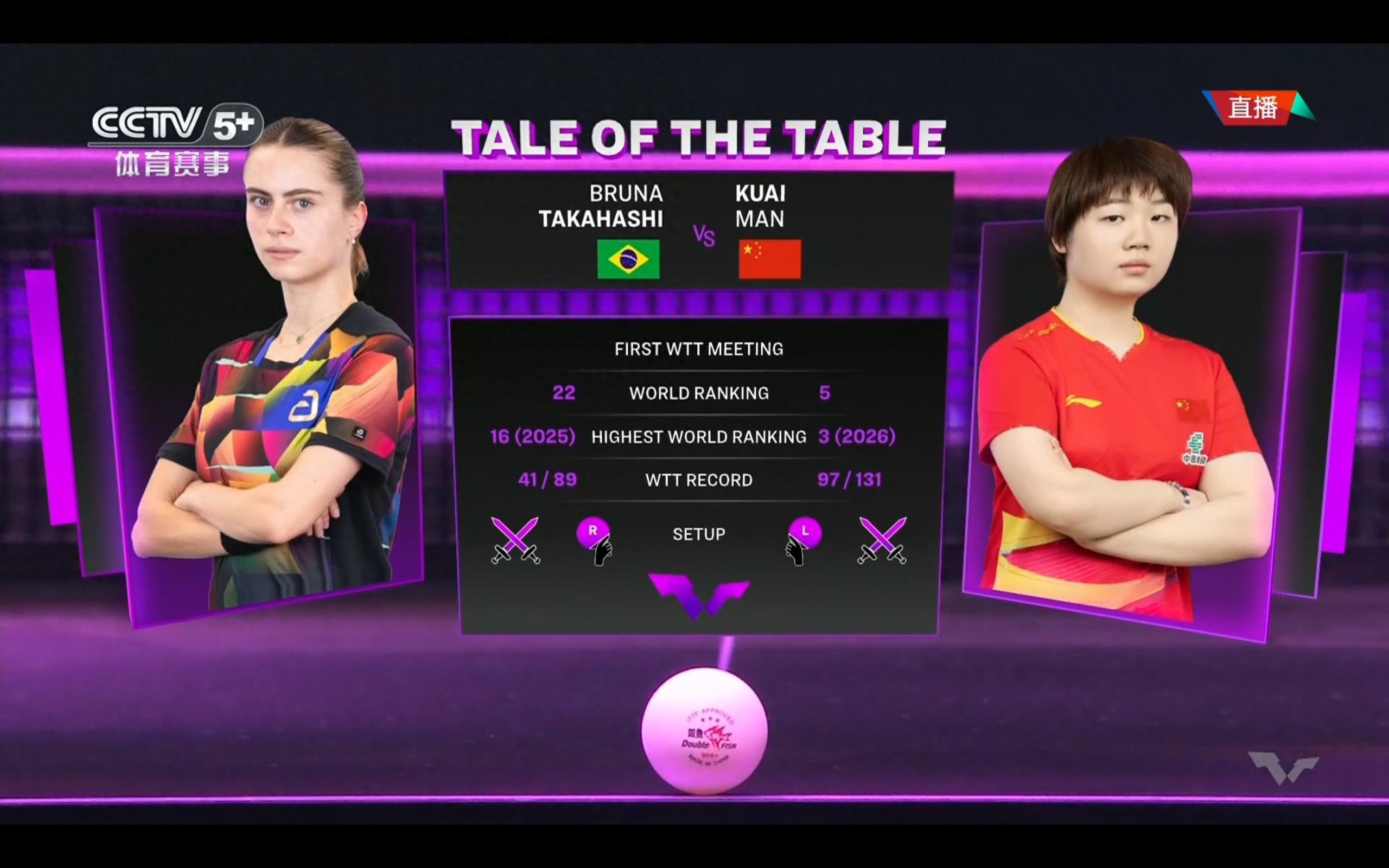 The WTT Chongqing Championship table tennis match between Kuai Man and Bruna is currently live, followed by Wang Chuqin's appearance.