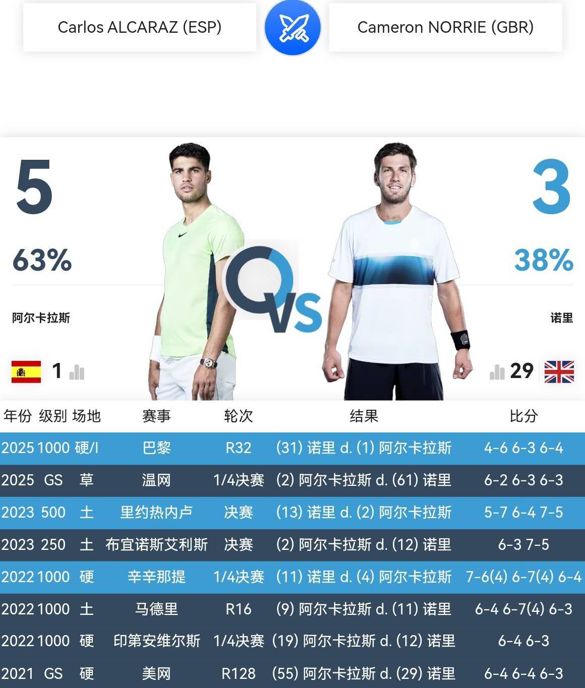 Fourthly, in their most recent encounter, world number one Alcaraz was reversed and defeated by Norrie, receiving a shocking blow and a painful lesson. In the second round of the 2025 Paris Masters, Alcaraz, who had just returned to world number one after winning the US Open, lost two consecutive sets after winning the first, suffering a reversal elimination by Norrie. This was Norrie's first career win against a reigning world number one, abruptly ending Alcaraz's impressive 2025 season streak of 17 Masters wins and reaching finals in nine consecutive events with seven titles.