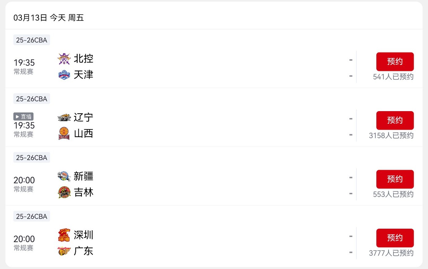 CBA schedule today (March 13, 2026): Liaoning Bengang vs Shanxi Fenjiu, live on CCTV-5+ channel.
