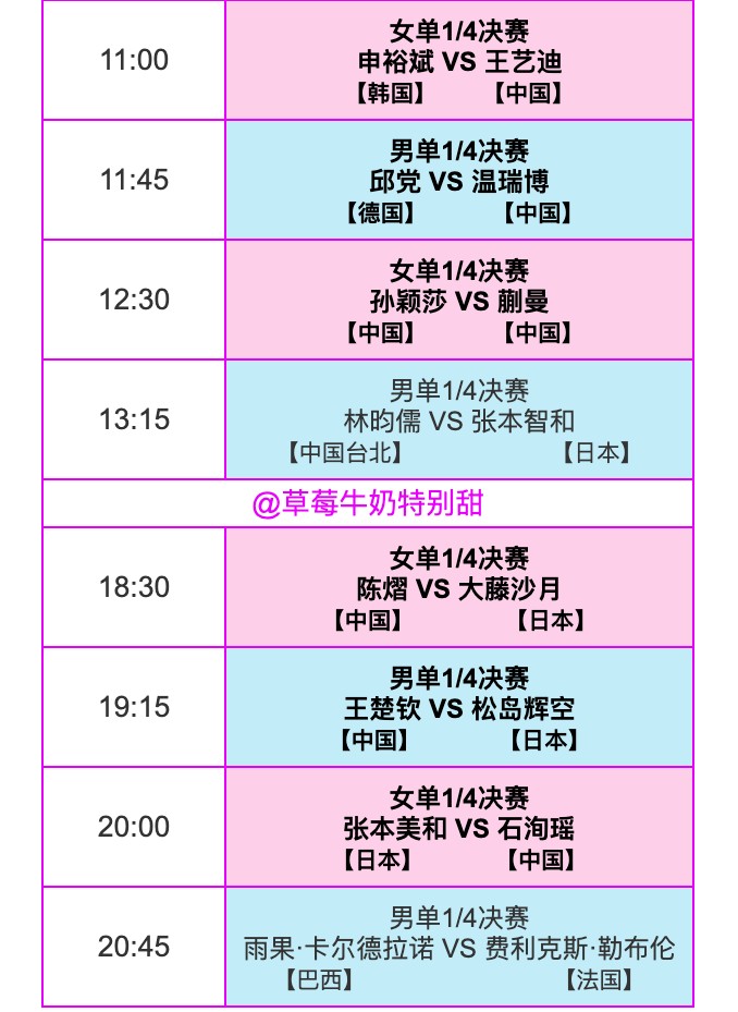 Tomorrow is the quarter-final stage, using a best-of-seven games system. National team players Sun Yingsha, Wang Chuqin, and others will play in six matches; specifics are provided in the following image.
