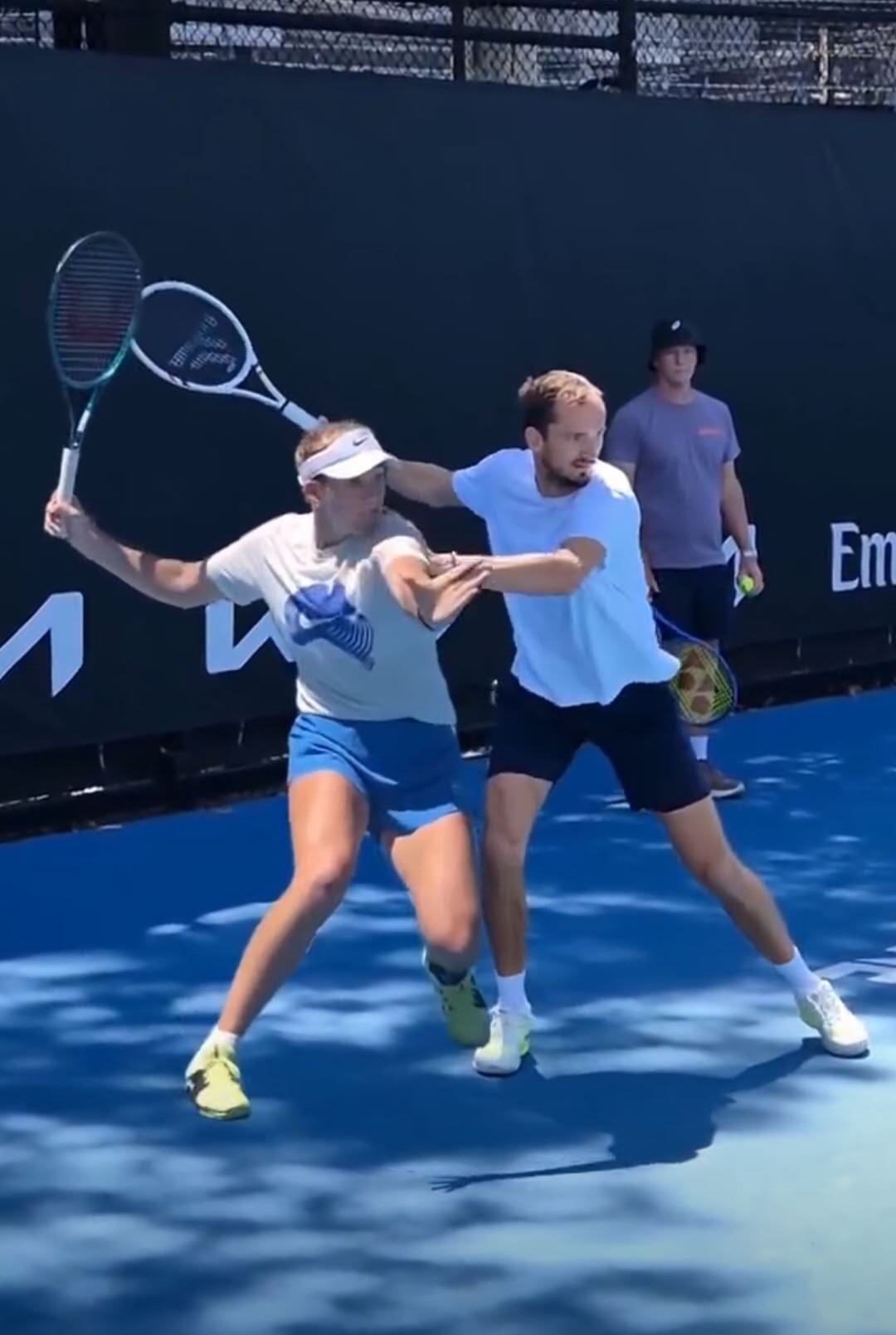 Unlike Andreeva, Medvedev’s preparation is more concise, or rather more compact. His forehand preparation almost begins directly from the chest, with the racket head pointed diagonally upward toward the court, not lifted too high, and staying closer to the body. The racket moves within a small range. The benefit is immediate: the racket reaches the hitting position in the shortest time, then drives through the ball horizontally, without a clear “dropping of the racket head.” Overall, Medvedev’s stroke appears more efficient and streamlined, with no superfluous “fluctuation.”