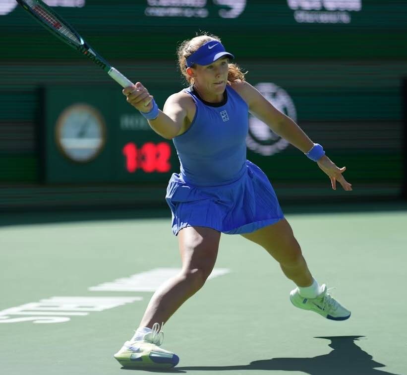 From this short video, distinct differences in their preparation phases can be observed. In the footage, Andreeva’s forehand preparation starts from one side of her body, accompanied by a pronounced “straight up and down” large motion—the racket lifts from waist level to above the shoulder, then drops before swinging to the contact point. Throughout this process, the arm swing is extensive, nearly vertical in trajectory, and includes a noticeable “dropping of the racket head.”