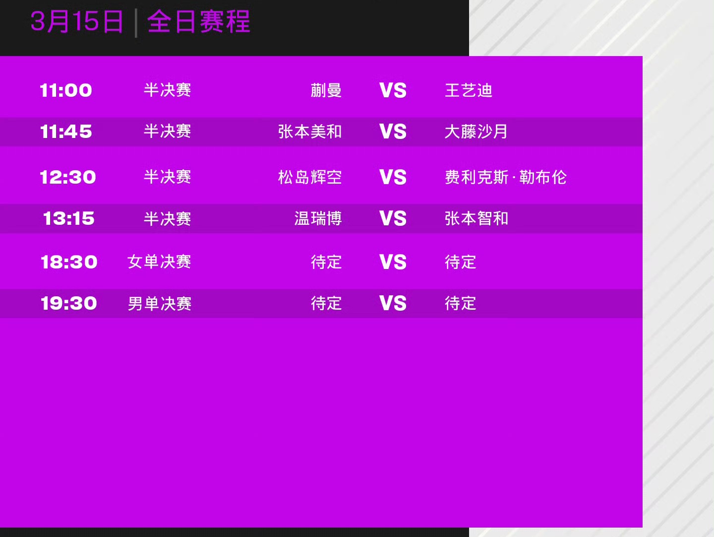 Today features the semifinals and finals, using a best-of-seven format. Three Chinese national team players are competing; details are shown in the image below.