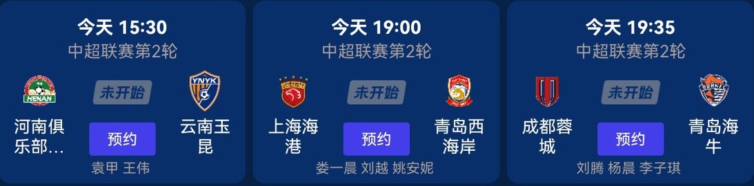 Chinese Super League schedule today (March 15, 2026): three matches kick off, live on Migu Video.