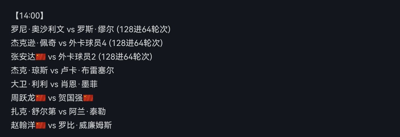 2. Tomorrow at 2:00 PM: O'Sullivan vs. Muir, Zhang Anda vs. a wildcard player, Shaun Murphy vs. David Lilly, Zhou Yuelong vs. He Guoqiang, Zhao Hanyang vs. Robbie Williams.Personal prediction: O'Sullivan, Zhang Anda, Shaun Murphy, and Zhou Yuelong will defeat their respective opponents and advance to the next round.He Guoqiang and Zhao Hanyang will lose and be eliminated.