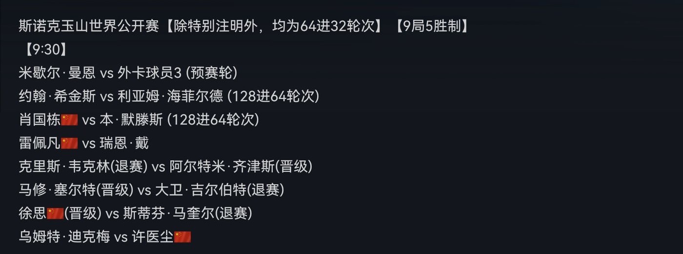 Tomorrow at 9:30 AM: Higgins vs. Hayfield,Xiao Guodong vs. Mertens, Lei Peifan vs. Ryan Day, Xu Si advances directly to the Round of 32, Xu Yichen faces Dick May.Personal prediction: Higgins, Xiao Guodong, Lei Peifan, and Xu Si will advance; Xu Yichen is likely to be eliminated.