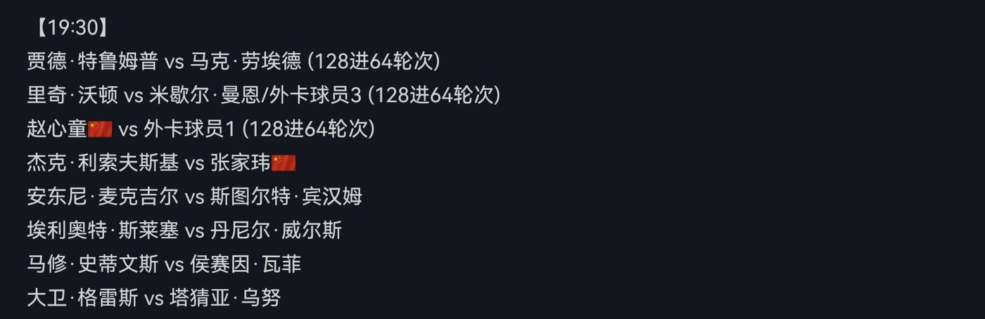3. Tomorrow at 7:30 PM: Trump vs. Lloyd,Zhao Xintong vs. a wildcard player,Zhang Jiawei vs. Lisowski.Personal prediction: Trump, Zhao Xintong, and Lisowski will win and advance to the next round.