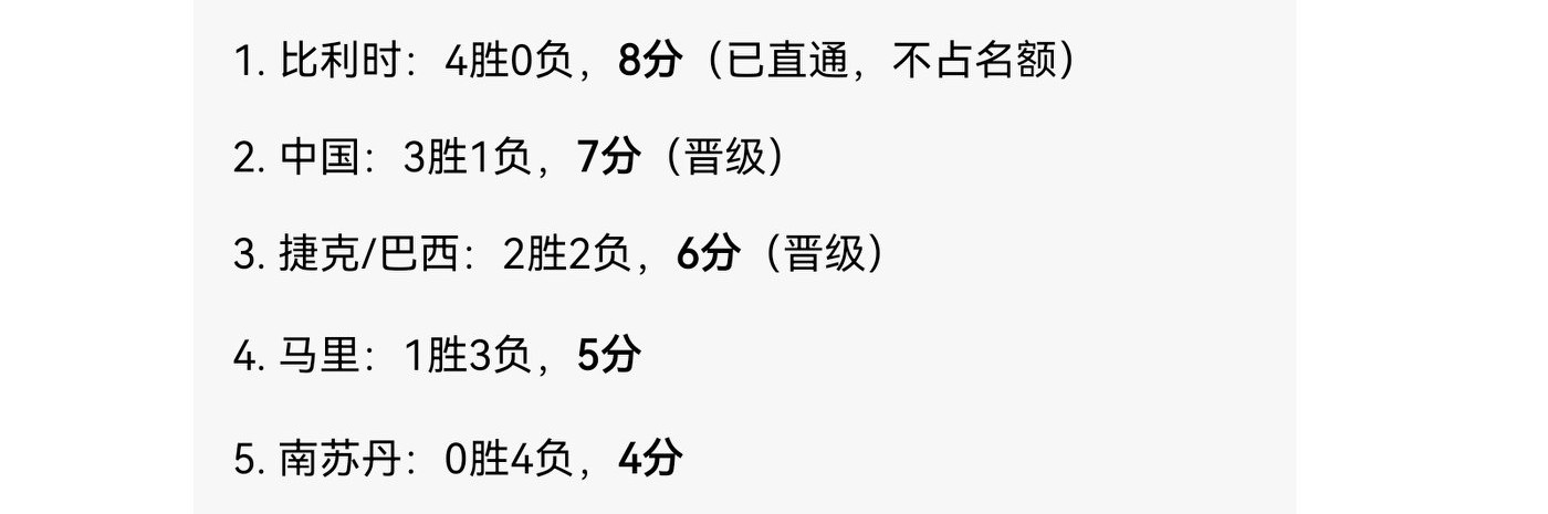 Currently, the Chinese Women's Basketball team has 3 wins and 1 loss, earning 7 points and ranking second in the group. They have already qualified for this year's Women's Basketball World Cup. Congratulations to the Chinese Women's Basketball team.