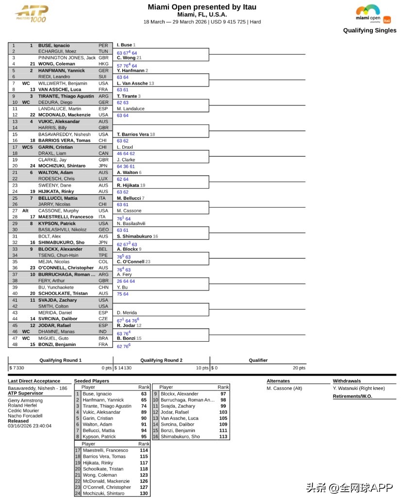On March 16 local time, the 2026 ATP/WTA1000 Miami qualifiers commenced, with Yuan Yue, Bu Yunchaoke, and Huang Zelin all successfully claiming opening victories on the first day. The qualifiers were originally scheduled to start on March 15, but adverse weather conditions forced a one-day postponement of the first round.