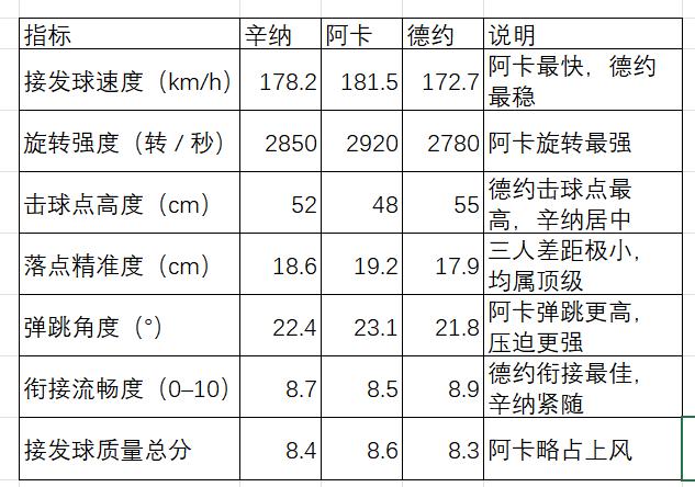 (1) Quality Dimension: Alcaraz excels in speed, spin, and bounce, achieving the highest total return quality score; Djokovic has the best transition smoothness and a higher contact point (I analyze two reasons: first, opponents' serves bounce higher; second, Djokovic returns the opponent's serve earlier), showing stronger stability; Sinner is intermediate, with outstanding balance.