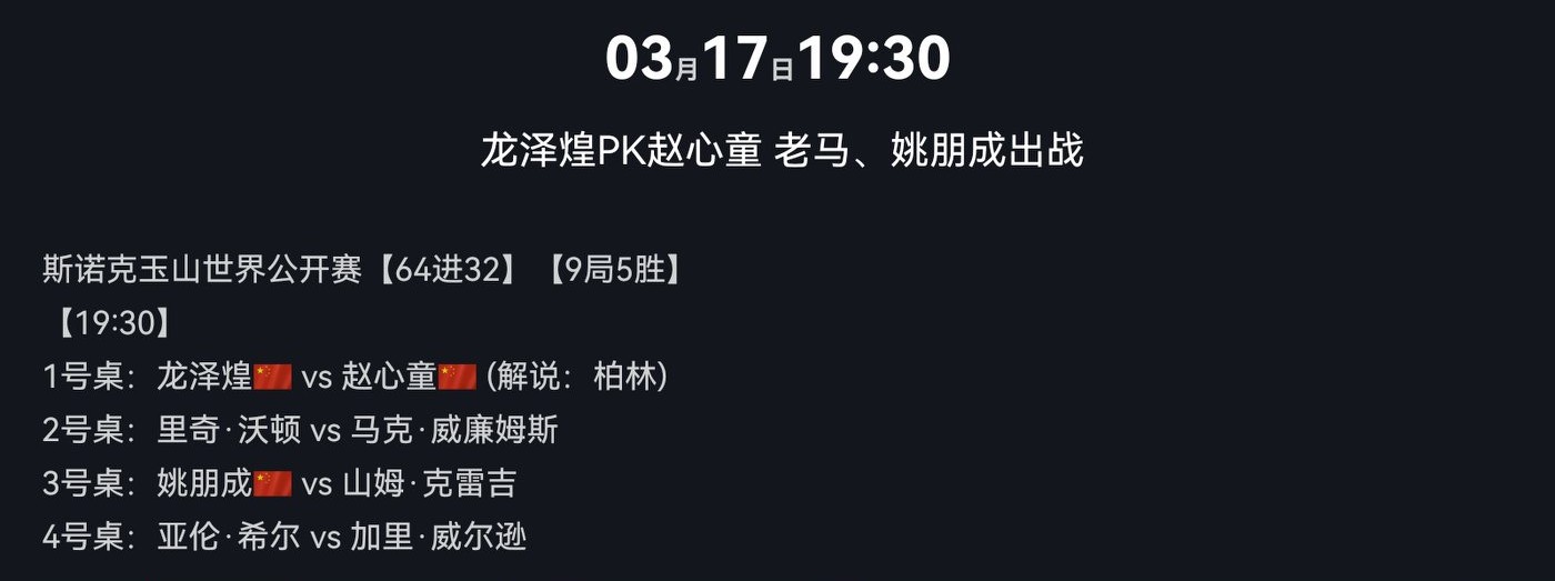 Tonight at 7:30 PM, Zhao Xintong vs. Long Zehuang will be broadcast on CCTV Video and Huya. Additionally, Mark Williams will face Walden. We hope they all win and advance to the next round.