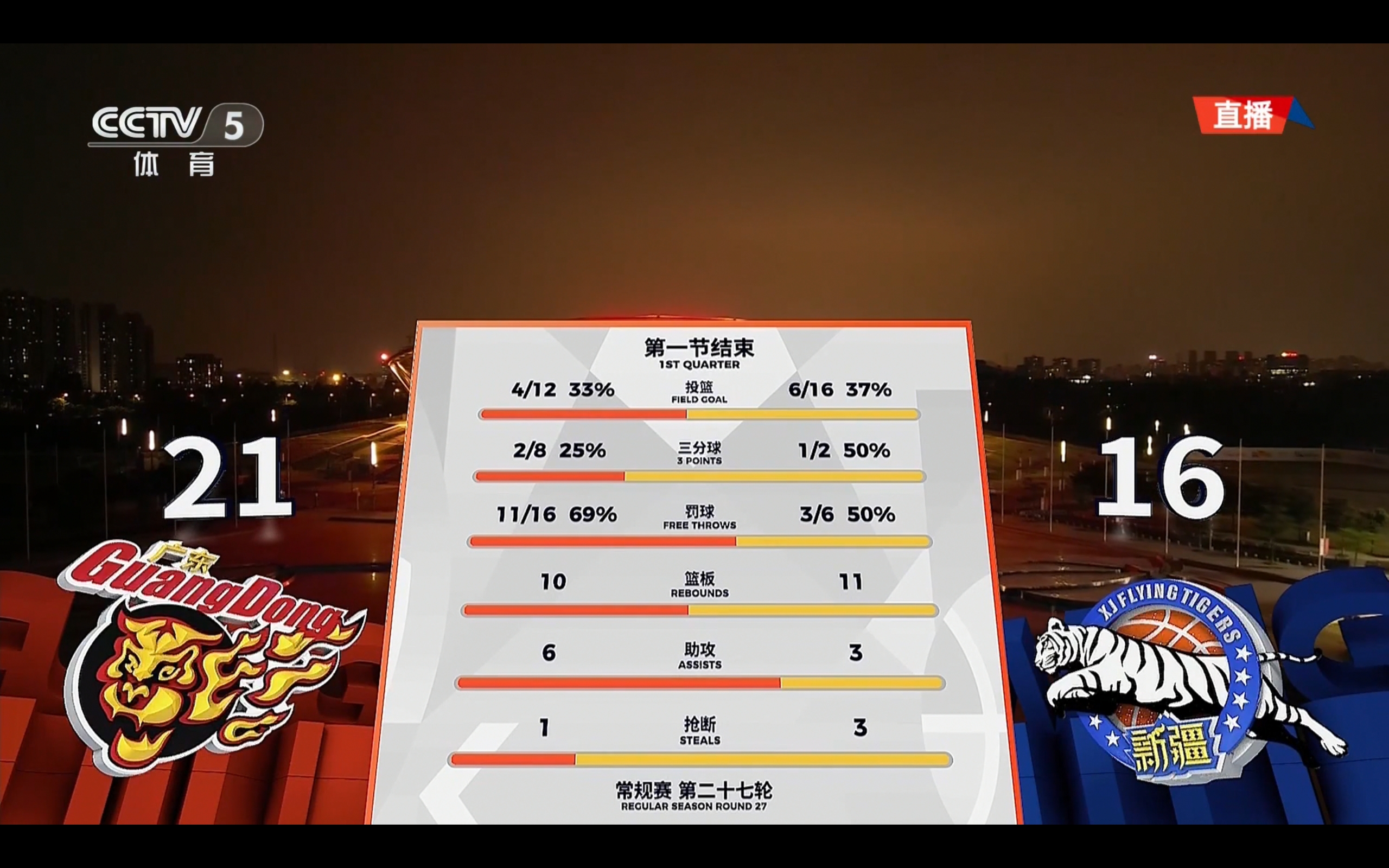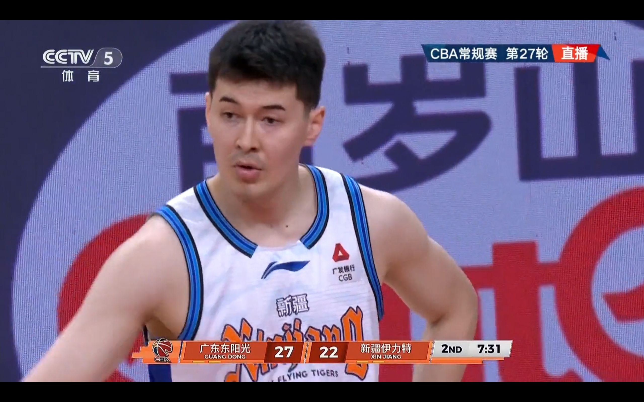 CCTV-5 is live broadcasting the CBA Round 27 regular season match between Guangdong Dongguan Guangsha and Xinjiang Yili.