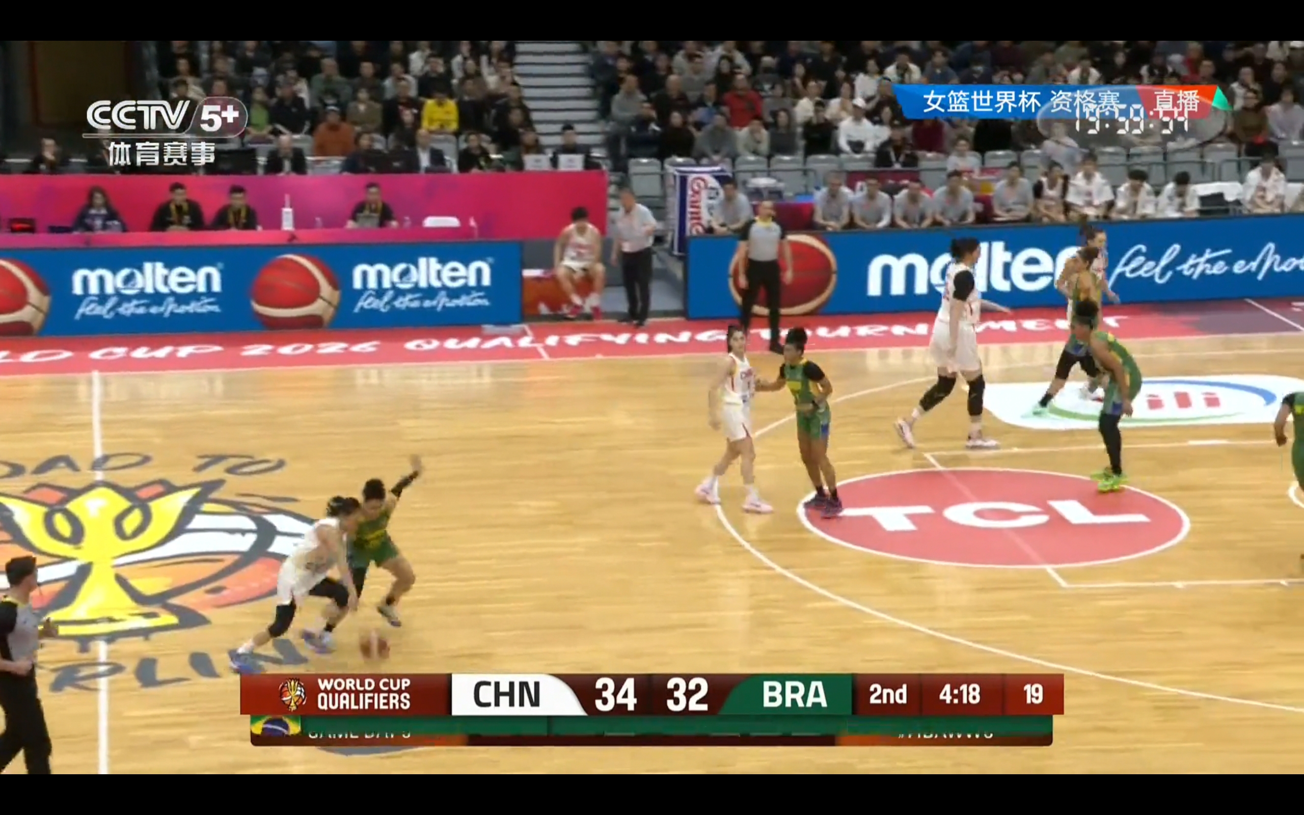 The game is currently in the second quarter, with the Chinese women's basketball team leading Brazil 34-32.