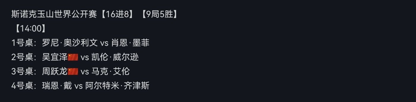 The stage is the round of 16 advancing to the quarter-finals, still using a best-of-nine frames format. Detailed schedule arrangements are shown in the image below.