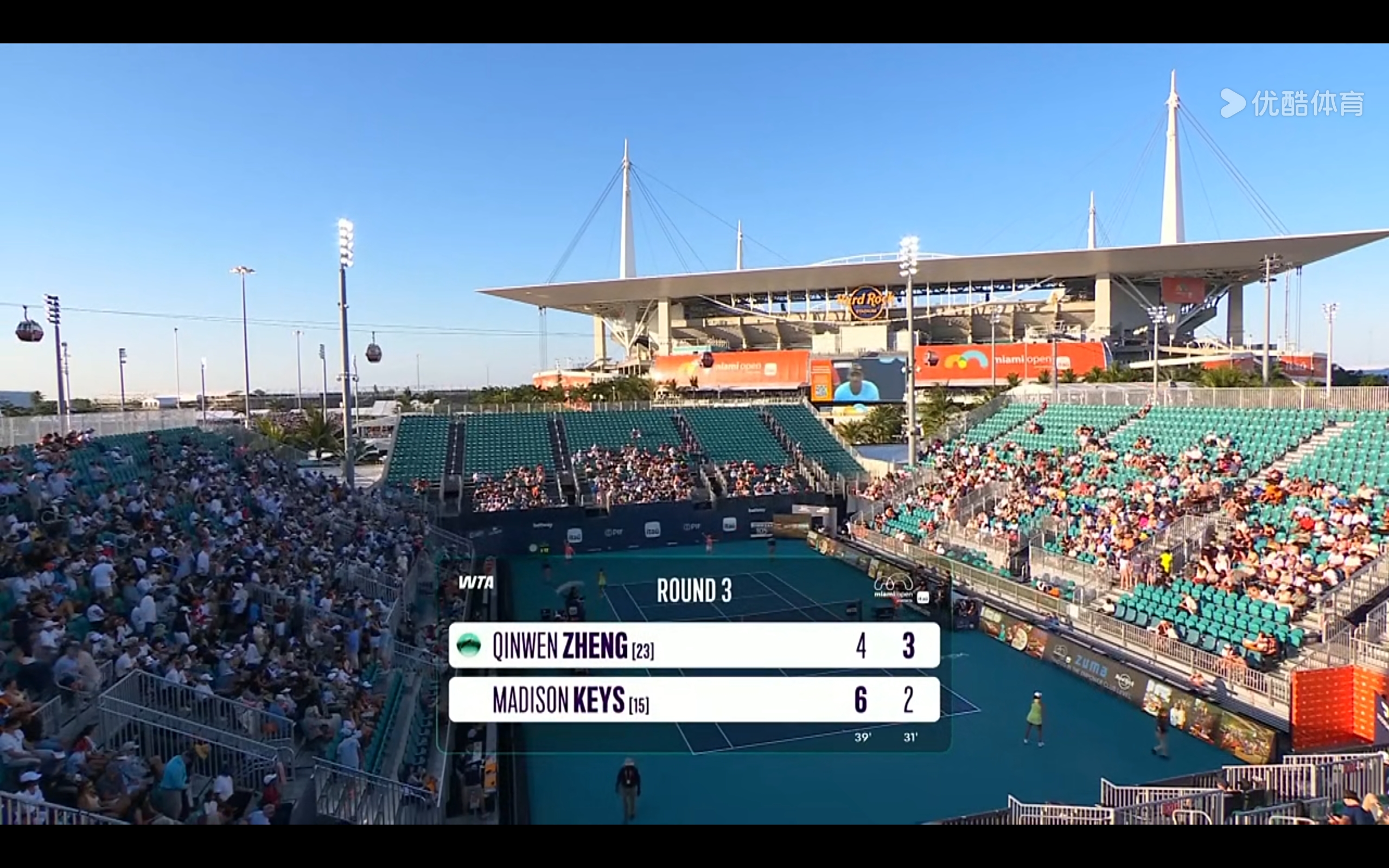 The Youku Sports channel is offering a free live broadcast of the WTA1000 Miami match between Zheng Qinwen and Keys.