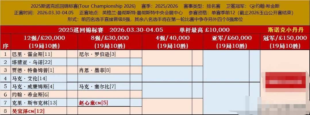 Latest schedule and prize money for the Snooker Tour Championship. The Tour Championship is a lucrative event, inviting only the top 12 players of the season. The Chinese players participating are Zhao Xintong and Wu Yize. Details are as follows.