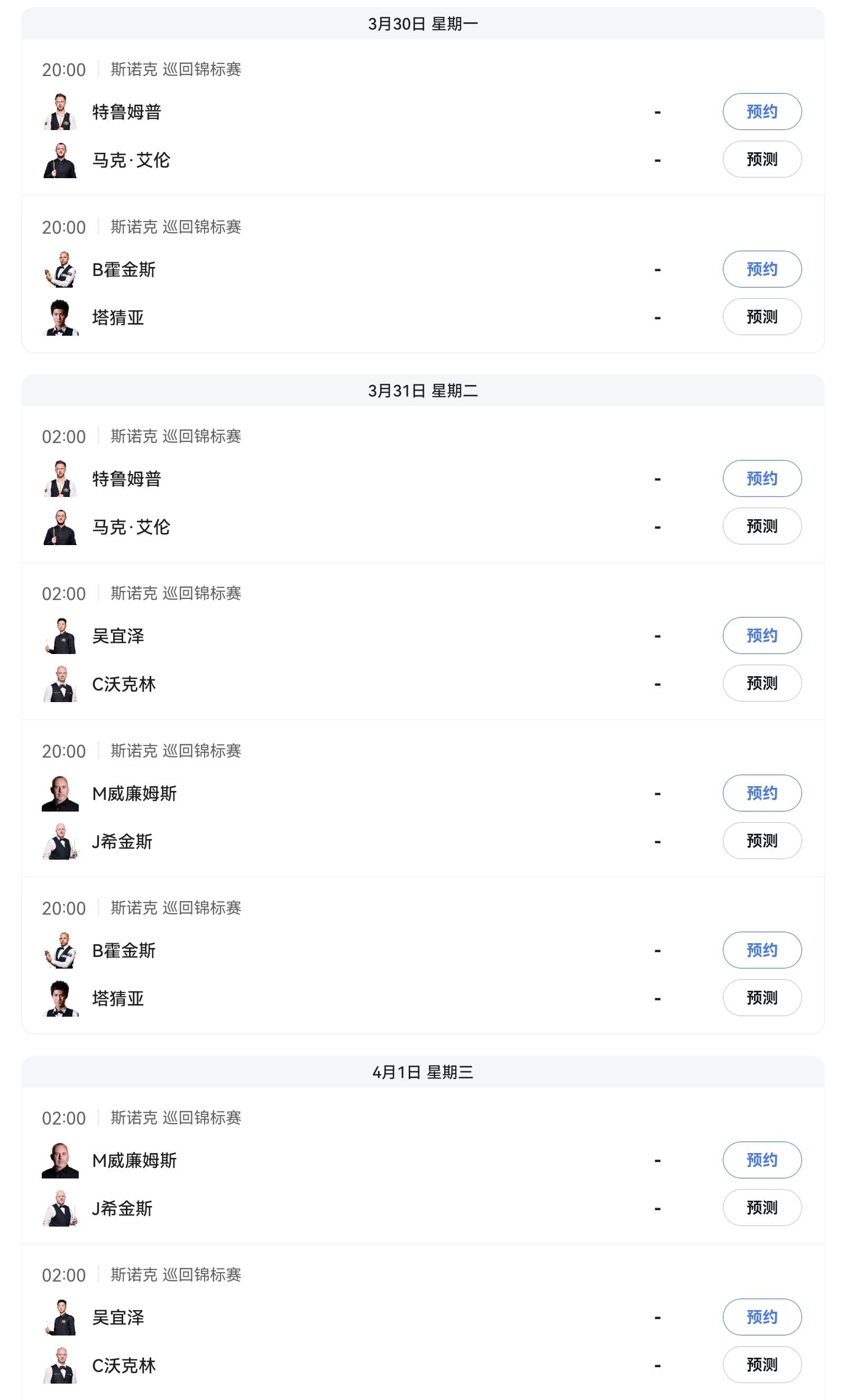 1. At 2 a.m. on March 31, 2026,Wu Yize vs. Wakelin, Stage 1 match, consisting of nine frames.
