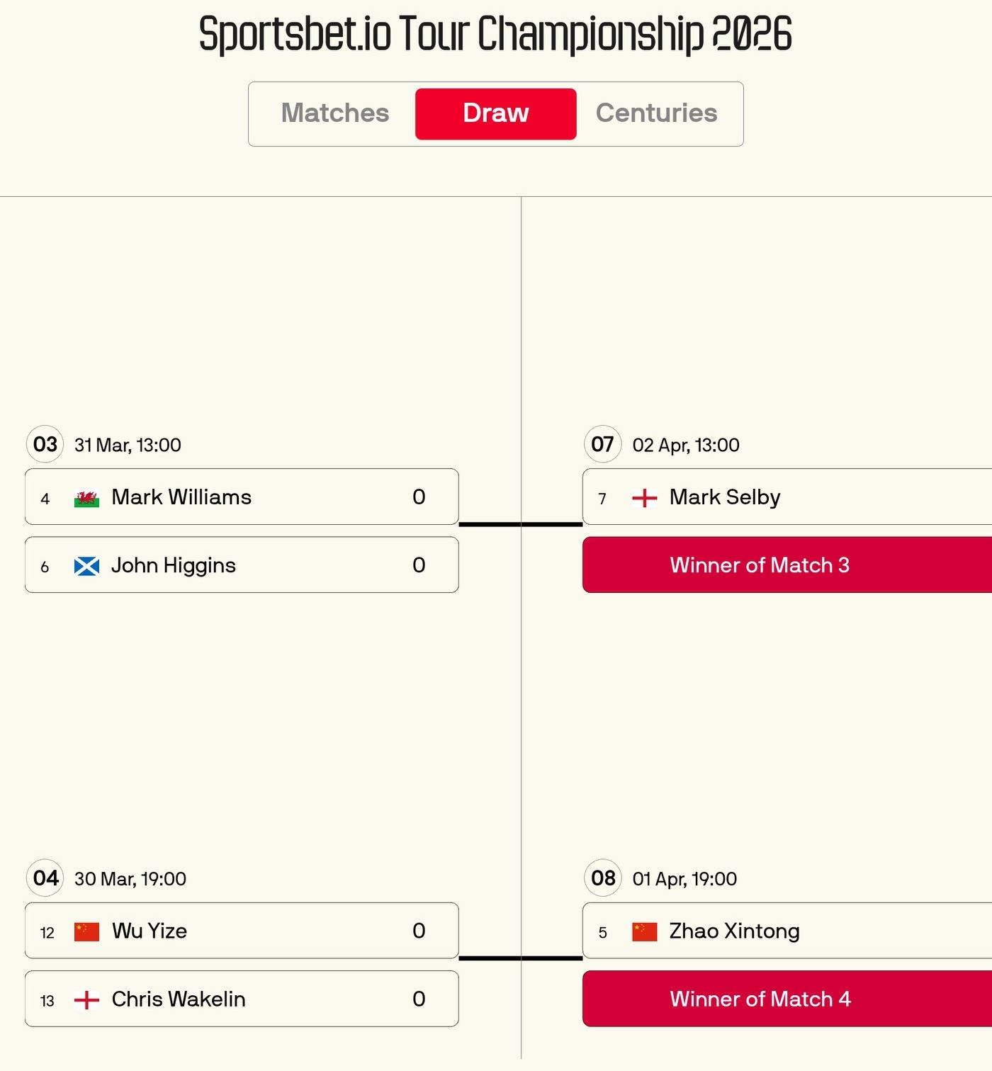 3. Draw details are shown in the image below. The top four players of the season advance directly to the quarter-finals. The eight players ranked 5th to 12th compete for the remaining four quarter-final spots. Therefore,Wu Yize will participate in the first round, facing Wakelin. Zhao Xintong will play in the quarter-final against the winner of Wu Yize and Wakelin.