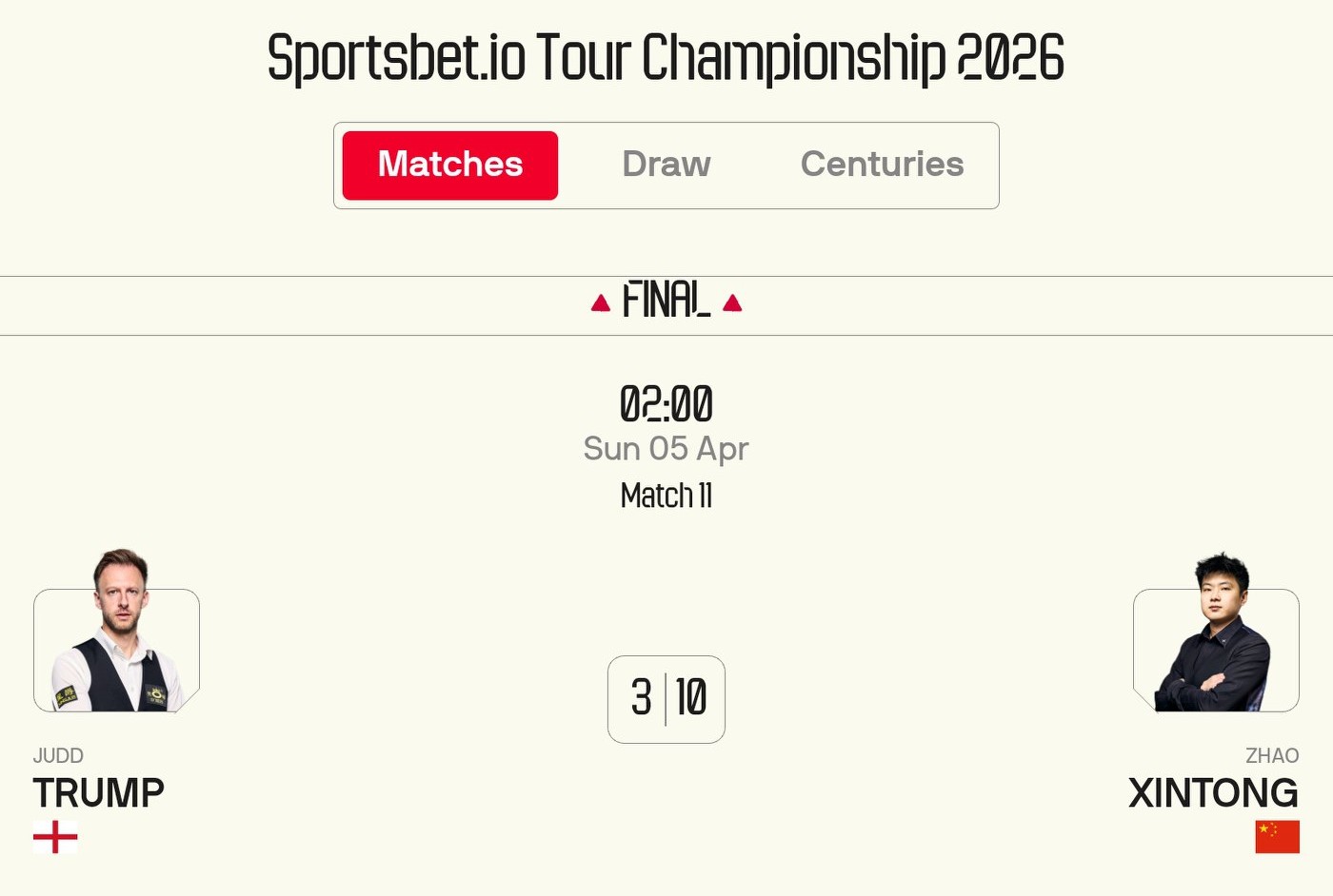 In the first stage, Zhao Xintong led Trump 5-3; in the second stage, Zhao delivered a five-frame winning streak against Trump, ultimately winning 10-3 to claim the title.