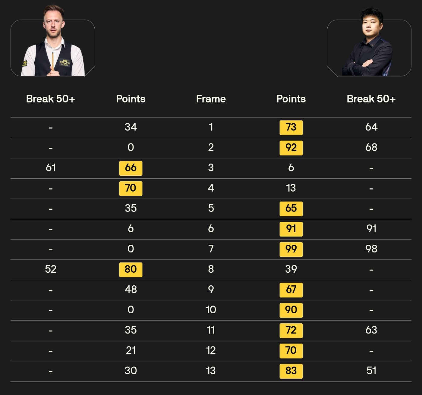 The detailed statistics of this match are shown in the figure below. In the first stage, Zhao had a three-frame winning streak; in the second stage, he directly delivered a five-frame streak, demonstrating strong prowess. Zhao totaled six 50+ breaks, while Trump only had two, indicating Zhao's offensive capability surpassed Trump's.
