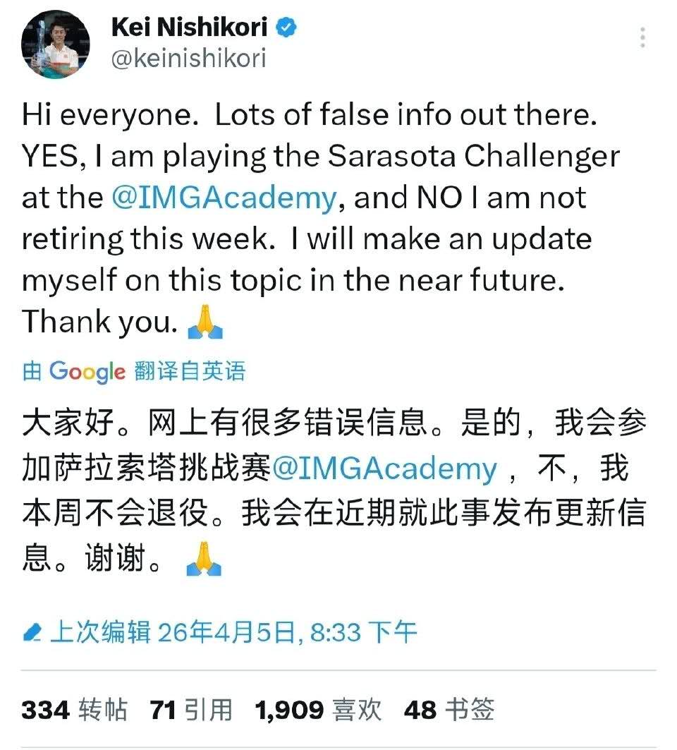 Nishikori's personal response then completely paused this controversy. On April 5 (Beijing time), Nishikori publicly stated on Twitter: "Hello everyone, there is a lot of false information circulating. Yes, I will participate in the Sarasota Challenger at the IMG Academy. No, I will not retire this week." In his post, he thanked fans for their concern and also left a statement for the public to watch closely—"I will personally update you on this matter in the near future."