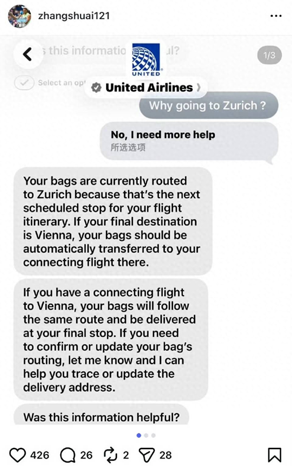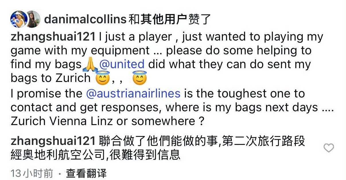 事件回顧:張帥數日前前往奧地利林茨準備參賽,行李卻未隨機抵達。經過多番輾轉,美聯航將行李送至蘇黎世,但後續如何轉運至林茨,奧地利航空的應對令她徹底失望。