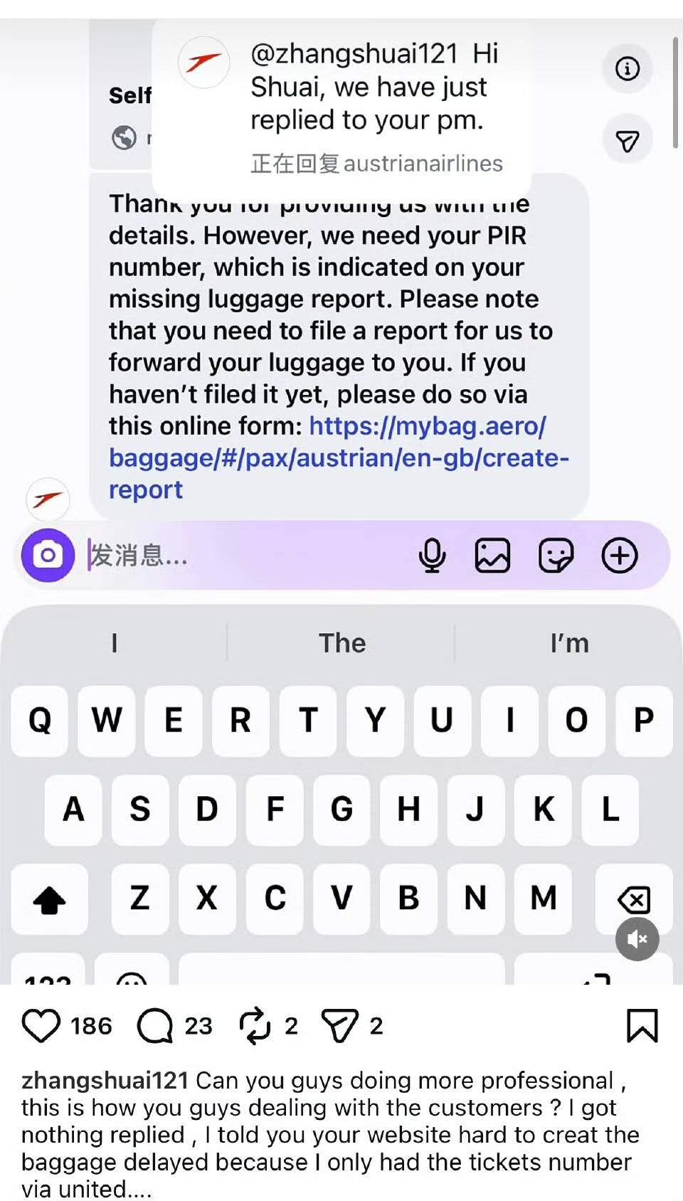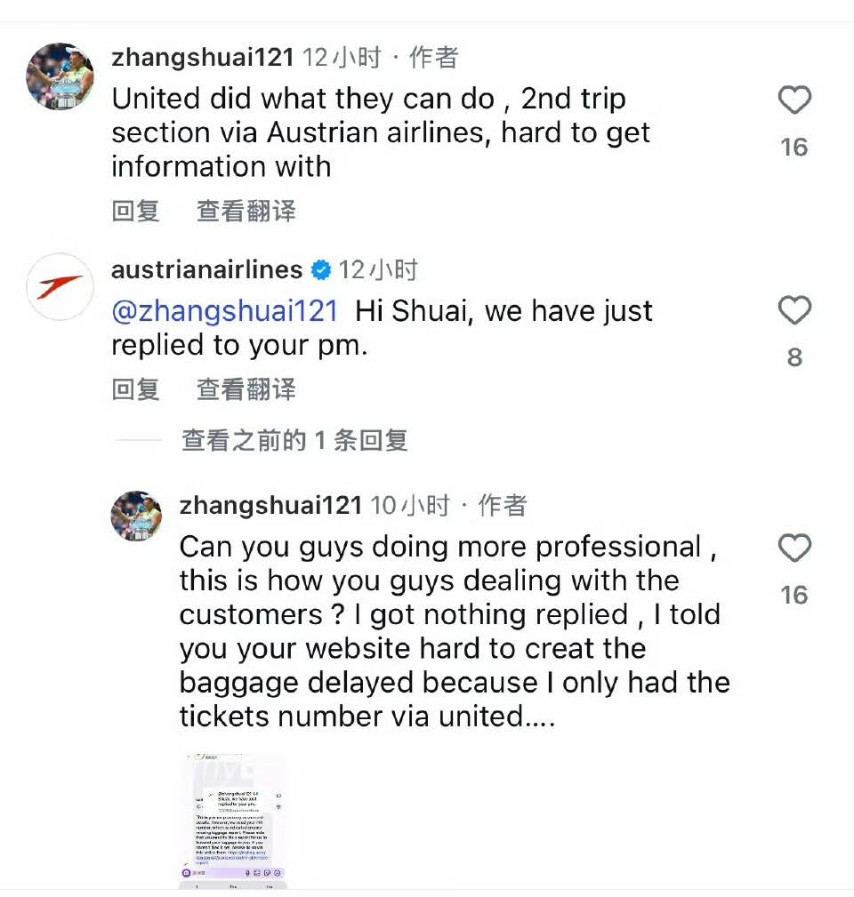 值得一提的是,面對輿論壓力,奧地利航空在其官方帳號評論區回應稱,已透過私信聯繫張帥,將提供解決方案。
