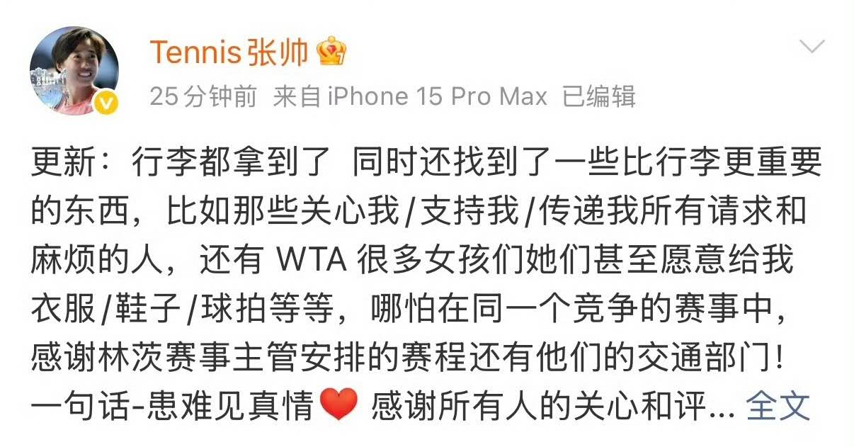 無論如何,在經歷了一波三折的「行李遺失」事件後,總算等來了好消息,現在就讓我們祝願張帥在林茨站的比賽中一切順利,打出好成績吧!(來源:網球之家 作者:陸小天)