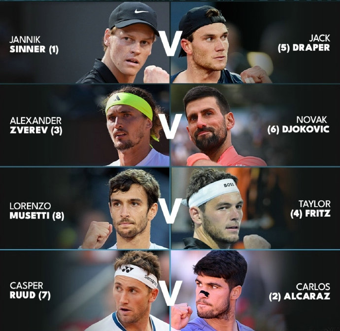 Let's turn to the French Open. Last night, Beijing time, the draw ceremony for the 2025 French Open tennis tournament was held, and the draw table was released. Men's Singles: The top eight seeds are aligned with Sinner-Draper, Zverev-Djokovic in the top half; In the bottom half, Musetti Fritz, Ruud Alcaraz.