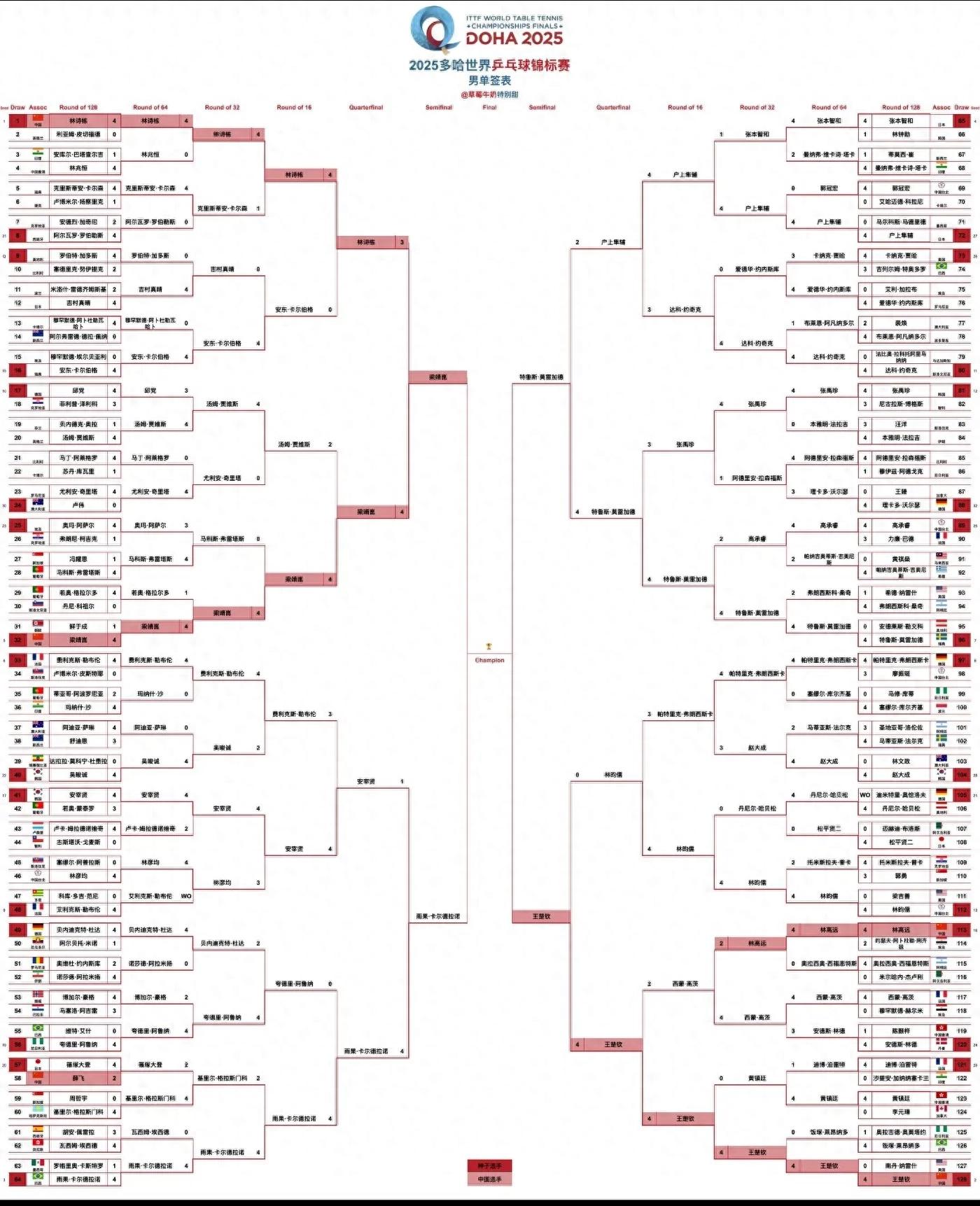 The signing table for the men's singles semifinals of the Doha World Table Tennis Championships has been confirmed, and the two national table tennis players have advanced, the details are as follows.