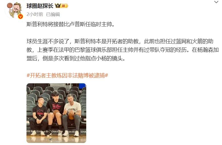 根據爆料達人Shams的報導:蒂亞戈·斯普利特接替比盧普斯,暫時擔任開拓者主教練職務。