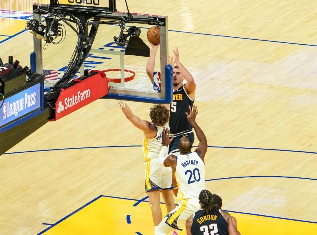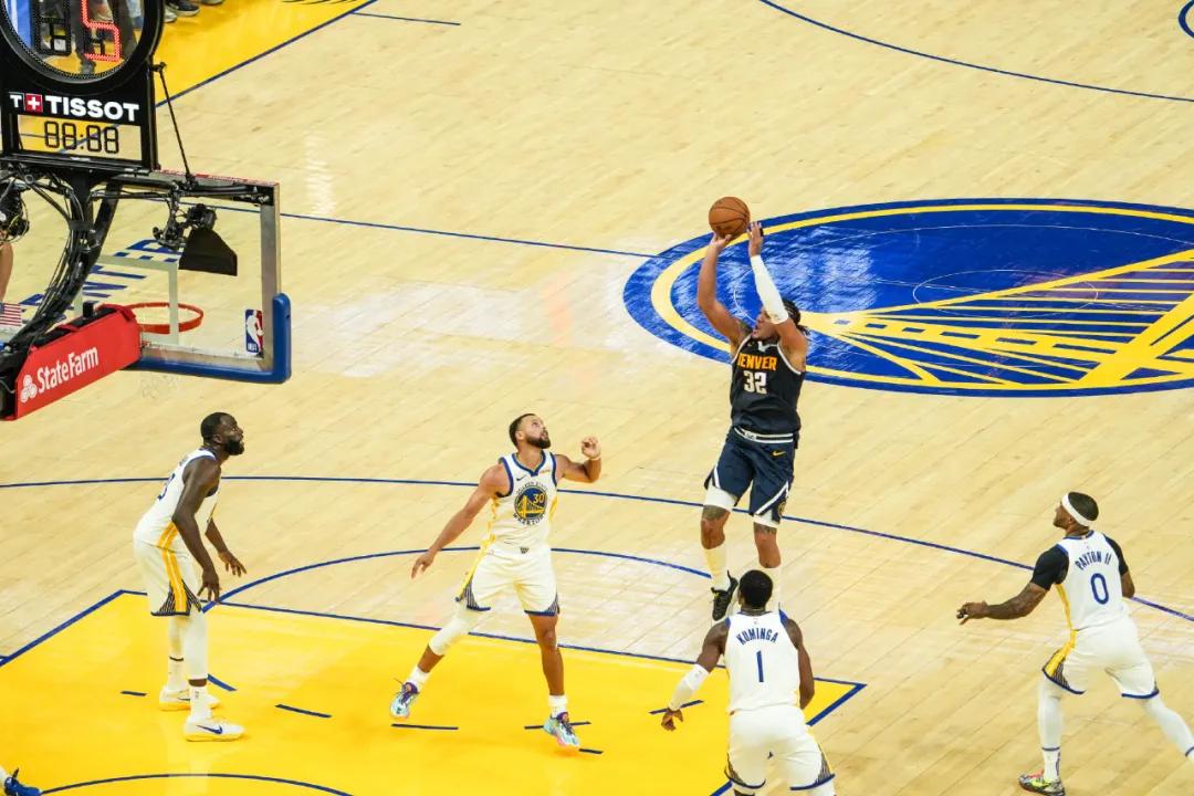 掘金上半場三分命中率18投10中,但下半場大幅下滑,第三節僅13投2中。勇士則用一節時間將比分追平,庫里第三節手感回溫,雙方再度展開對攻。