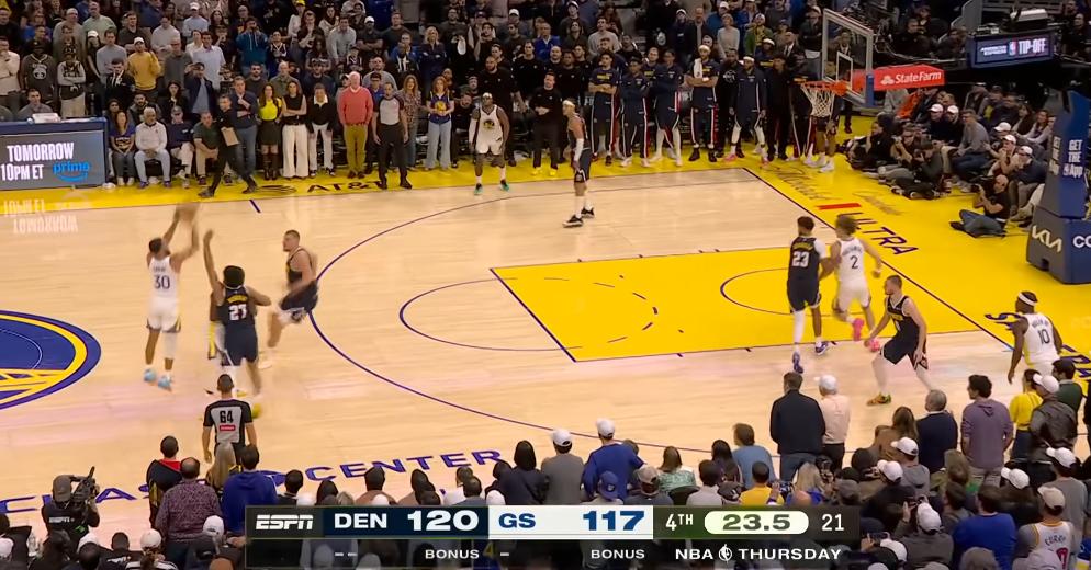 比賽結束了嗎?不,才剛開始。下一回合,庫里接球,利用追夢的擋拆,在防守縫隙中獲得三分出手機會。事後看來,約基奇本應上前封阻,但考慮到距離,他選擇回防籃板。