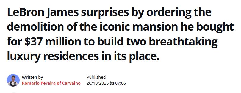 北京時間10月27日,美媒CPG報導指出,詹姆斯做出了一個可能令人意外的決定,他將拆除2020年以3700萬美元買下的一棟豪宅,準備在同一地塊上建造兩棟奢華住宅。