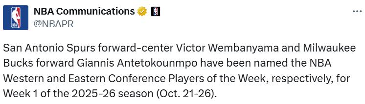 文班亞馬在賽季首周表現出色,帶領馬刺隊取得3勝0負的完美戰績。該週他場均33.3分、13.3籃板、2.3助攻(失誤僅0.7次)、1.7搶斷及6.0蓋帽。投籃命中率、三分命中率及罰球命中率分別為56.9%、36.4%及73.3%。他成為NBA史上首位在開季前三場比賽中至少得到100分和15次蓋帽的球員。