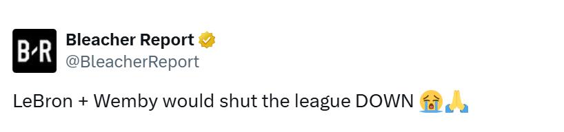 北京時間10月28日,知名美媒Bleacher Report在社交媒體更新表示:「詹姆斯和文班亞馬這對組合能夠直接稱霸聯盟!」他們認為馬刺應該尋求交易詹姆斯,促成這兩位狀元的聯手。