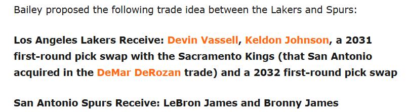 湖人隊獲得:瓦塞爾、凱爾登·約翰遜、一個2031年與國王隊的首輪選秀權互換權(由馬刺在德羅贊交易中獲得),以及一個2032年的首輪選秀權互換權。