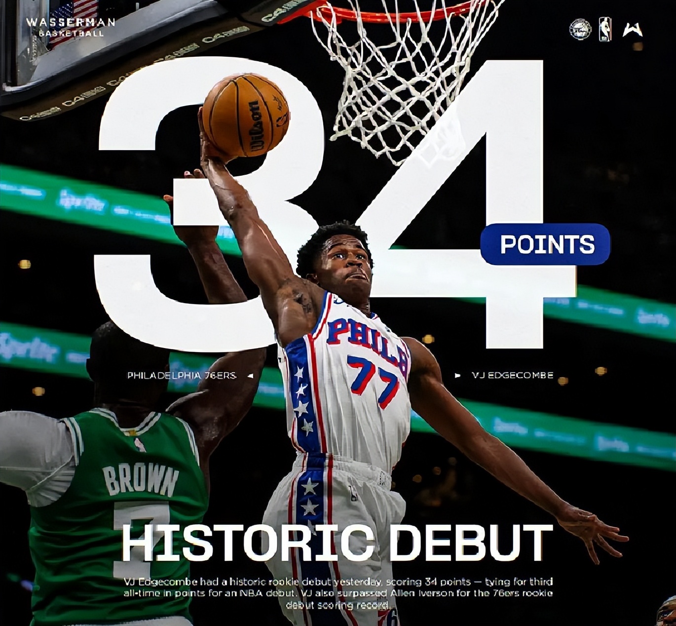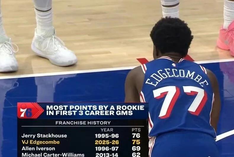 新秀賽季開局前三場狂砍75分,埃奇庫姆超越艾弗森(69分)成為費城隊史第二高,新高紀錄為斯塔克豪斯的76分。