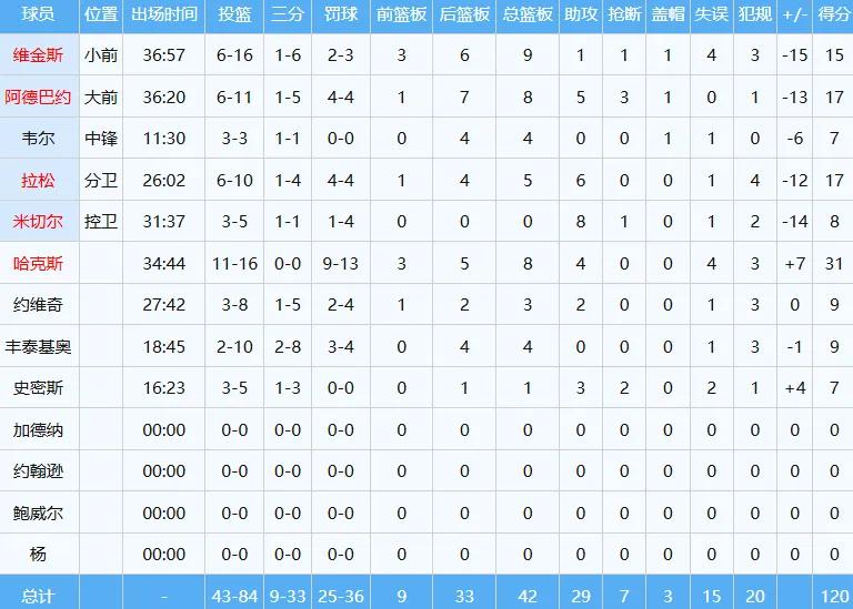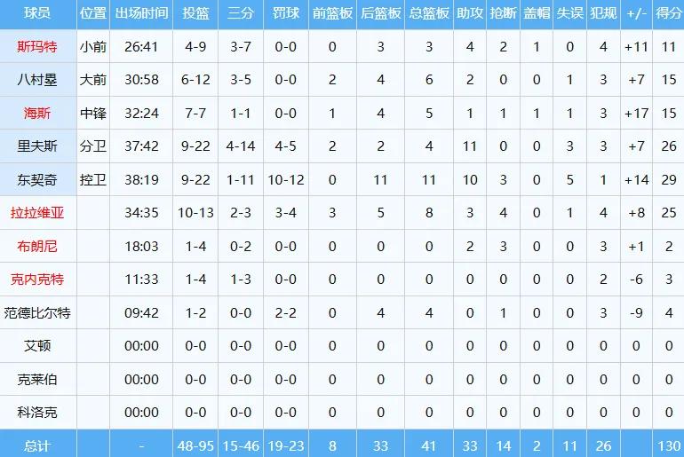 東契奇交出29分11籃板10助攻的三雙,里夫斯拿下26分11助攻的雙雙,拉拉維亞貢獻25分,三人合計80分。