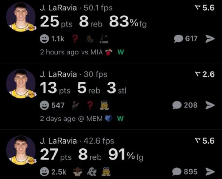 拉拉維亞在湖人三連勝期間,分別砍下27分8籃板2助攻1抄截、13分5籃板2助攻3抄截,以及25分8籃板3助攻4抄截,場均數據為21.7分7籃板2.3助攻2.7抄截,兩項命中率分別為78.1%和66.7%,真實命中率高達87.2%。