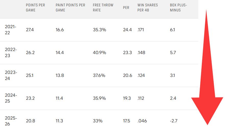 莫蘭特近期表現不像一位巨星。無論看得分數據或高階指標,都顯示自2022年達巔峰後,他表現持續下滑,場均得分從27.4分降至20.8分,連續4年下降。雖然莫蘭特只有26歲,但這些數據不禁令人覺得他已過巔峰,正處於下滑通道。