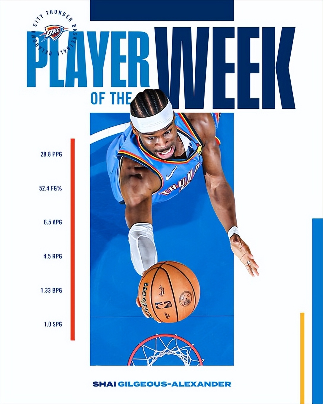過去一週,亞歷山大場均貢獻28.8分、4.5籃板與6.5助攻,投籃命中率達52.4%,三分球命中率31.6%,罰球命中率百分之百,帶領雷霆取得4勝0負的完美戰績。