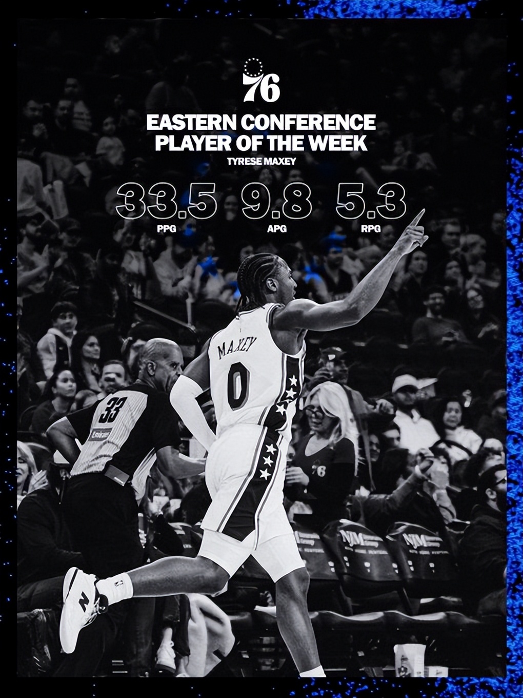 過去一週,馬克西場均繳出33.5分、5.3籃板與9.8助攻,投籃命中率46.7%,三分球命中率36.6%,罰球命中率89.2%,帶領76人取得3勝1負的成績。